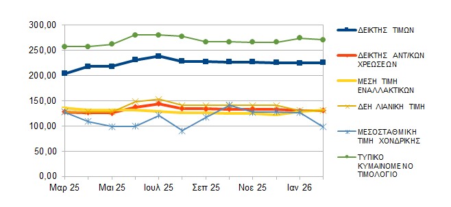 Ο Δείκτης Ανταγωνιστικών Τιμών για οικιακούς καταναλωτές, αυξήθηκε ελαφριά στα 130,82 ευρώ την μεγαβατώρα έναντι 130,37 τον Ιανουάριο. Οι τιμές των εναλλακτικών Παρόχων τον Φεβρουάριο σε μέσο όρο ήταν στα 131,49 ευρώ την μεγαβατώρα, αυξημένες σε σχέση με τον προηγούμενο μήνα (129,63 ευρώ την μεγαβατώρα). Οι τιμές της ΔΕΗ αντίθετα έμειναν σταθερές στα 131,00 ευρώ την μεγαβατώρα σε σχέση με τον Ιανουάριο. Στο Πίνακα που ακολουθεί φαίνεται η εξέλιξη του κόστους της αγοράς και των τιμών των εναλλακτικών και της ΔΕΗ τους τελευταίους 12 μήνες.