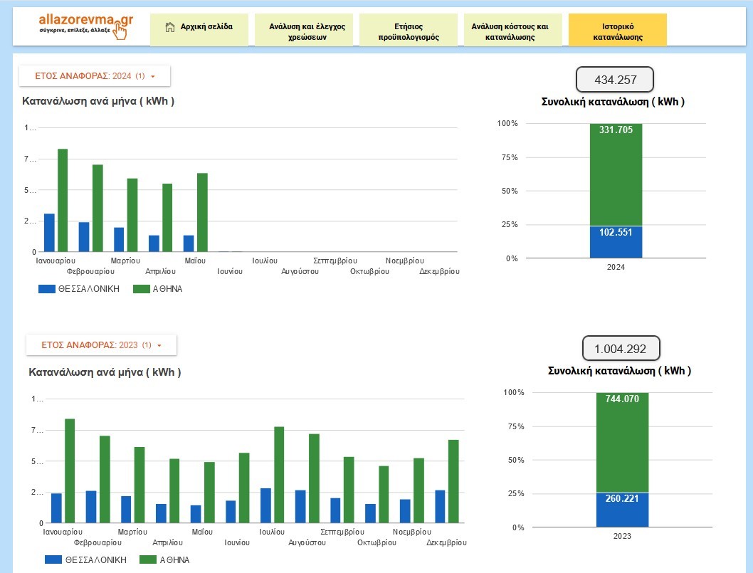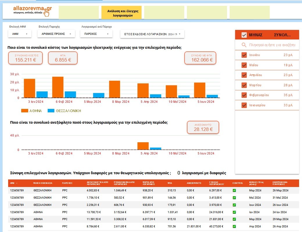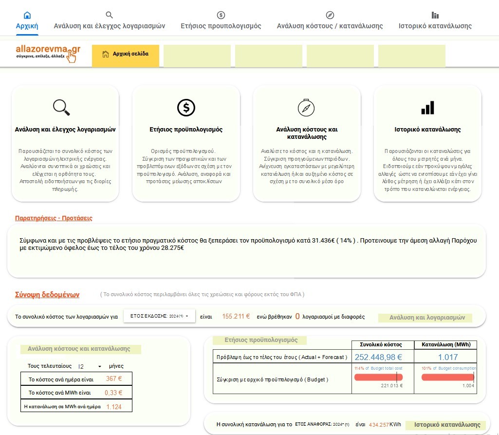 Η υπηρεσία μας προσφέρεται μέσω ειδικής πλατφόρμας προσαρμοσμένης στις δικές σας ανάγκες, στην οποία έχετε πρόσβαση ηλεκτρονικά μέσω προσωπικών κωδικών. Μέσω της πλατφόρμας, μπορείτε να περιηγηθείτε και να δείτε τα ανανεωμένα αποτελέσματα σε πραγματικό χρόνο. Η πλατφόρμα διαθέτει εύχρηστα φίλτρα που σας επιτρέπουν να επιλέξετε την περίοδο που σας ενδιαφέρει, συγκεκριμένες παροχές, και στοιχεία καταναλώσεων και δαπανών – τόσο ιστορικών όσο και προβλεπόμενων. Ο σύμβουλός σας από το allazorevma.gr παρακολουθεί την εξέλιξη των μεγεθών και σας απευθύνει μέσω της πλατφόρμας έγγραφες παρατηρήσεις και υποδείξεις όταν κρίνει ότι χρειάζονται.