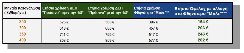 Δεν υπάρχει κανένας λόγος πλέον ένας καταναλωτής να παραμείνει στο “Πράσινο” τιμολόγιο της ΔΕΗ, ειδικά για κατανάλωση άνω τον 200 kWh τον μήνα . Το ίδιο ισχύει για το πράσινο τιμολόγιο οποιουδήποτε παρόχου αλλά ειδικά της ΔΕΗ που είναι η μόνη που εφαρμόζει αυξημένη χρέωση ανα κλίμακα κατανάλωσης.