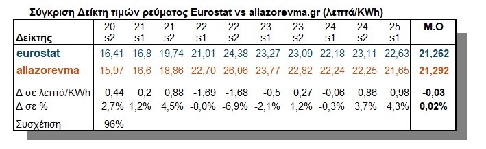 Στον Πίνακα παρακάτω παρουσιάζεται η σύγκριση μεταξύ των στοιχείων της Eurostat και αυτών του allazorevma.gr για τις τιμές του ρεύματος στην Ελλάδα από το 2ο εξάμηνο 2020 μέχρι το 1ο του 2025. Οι δύο χρονοσειρές έχουν βαθμό συσχέτισης 96% ενώ ο μέσος όρος της διαφοράς τους στο χρονικό διάστημα των 10 εξαμήνων είναι σε ποσοστό 0,02% ή 0,03 λεπτά την κιλοβατώρα!
