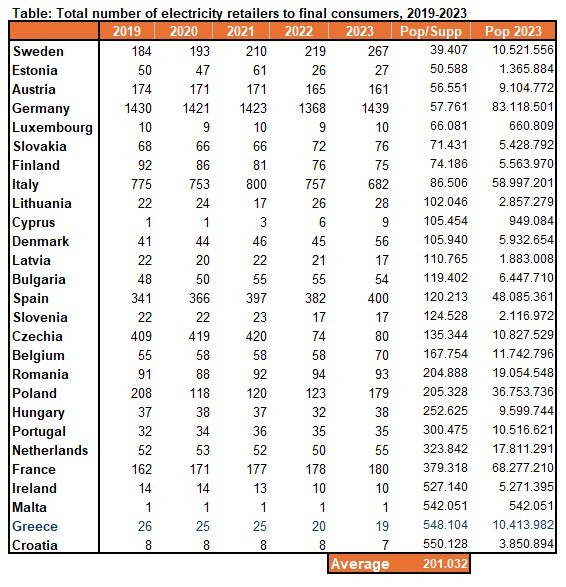 Μια πρόχειρη έρευνα στα στοιχεία της Eurostat επιβεβαίωσε ότι η υπόθεση αυτή σχετικά με τα υπόλοιπα κράτη-μέλη της ΕΕ είναι εύλογη. Όπως φαίνεται στον παρακάτω Πίνακα (που αποτελεί επεξεργασία από τον γράφοντα του πρωτότυπου στην ιστοσελίδα της Eurostat), ο αριθμός των κατοίκων ανά Πάροχο στην Ελλάδα – περίπου 550.000 – είναι πρακτικά ο μεγαλύτερος στην ΕΕ (μαζί με την Κροατία, την Ιρλανδία και την Μάλτα) και απέχει πολύ από τον μέσο όρο στην ΕΕ των 200.000 κατοίκων ανά Πάροχο. Αυτό αποτελεί μια πρώτη ένδειξη ότι, δυνητικά, στην ελληνική αγορά θα μπορούσαν να “χωρέσουν” περισσότεροι από 40 Πάροχοι στην λιανική ρεύματος (και φυσικού αερίου).