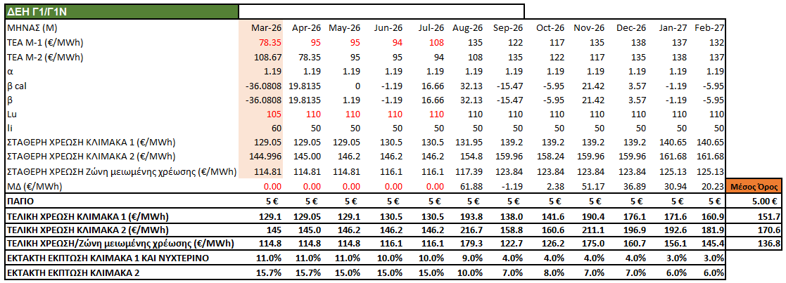 - Χρέωση ενέργειας ζώνης μειωμένης χρέωσης: 0,1368€/kWh