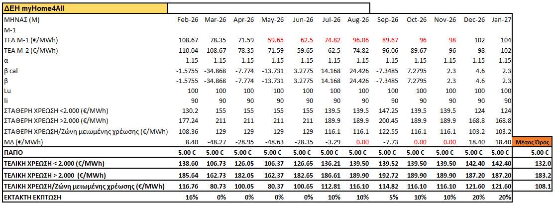 - Χρέωση ενέργειας για < 2000 kWh το 4μηνο: 0,1320€/kWh