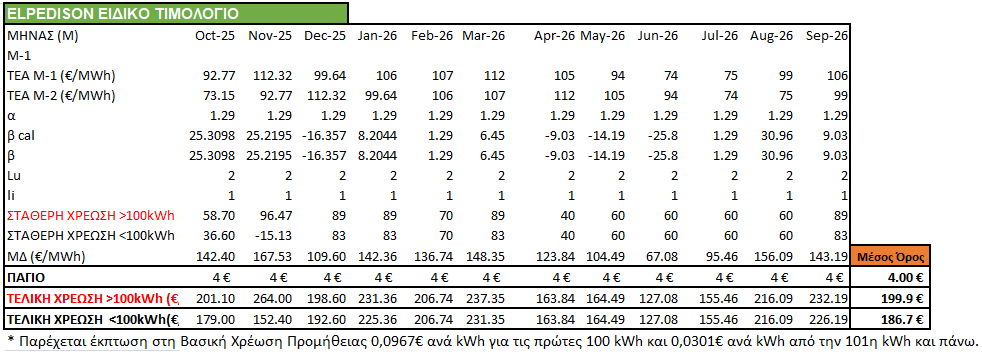 - Χρέωση ενέργειας <100 kWh: 0,1867€/kWh