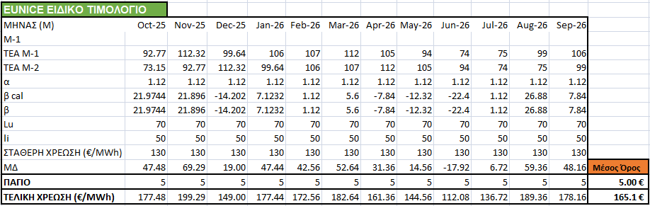 Χρέωση ενέργειας με υπολογισμό τυχόν μηχανισμού διακύμανσης με πρόβλεψη τιμών χονδρικής για τους επόμενους 12 μήνες.