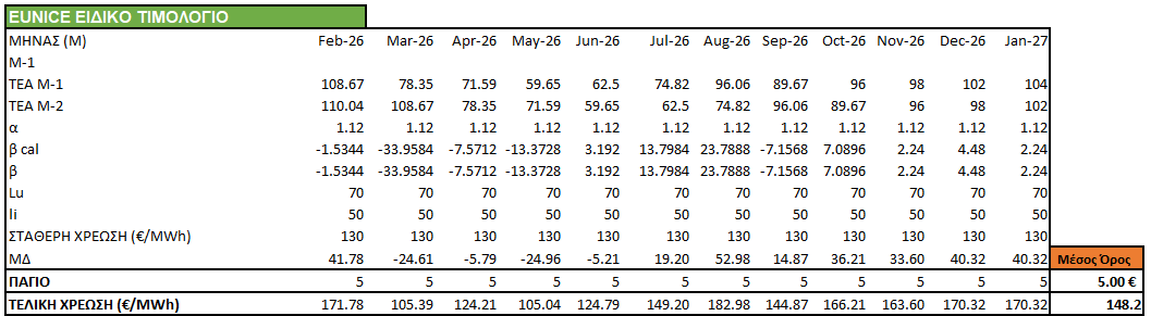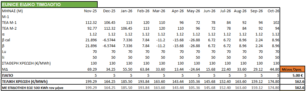 Χρέωση ενέργειας με υπολογισμό τυχόν μηχανισμού διακύμανσης με πρόβλεψη τιμών χονδρικής για τους επόμενους 12 μήνες.