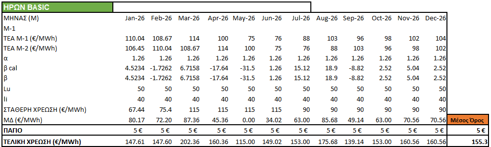 Χρέωση ενέργειας με υπολογισμό τυχόν μηχανισμού διακύμανσης με πρόβλεψη τιμών χονδρικής για τους επόμενους 12 μήνες.