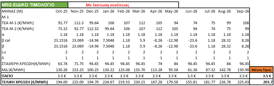Χρέωση ενέργειας με υπολογισμό τυχόν μηχανισμού διακύμανσης με πρόβλεψη τιμών χονδρικής για τους επόμενους 12 μήνες.