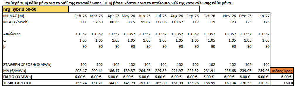 Χρέωση ενέργειας με υπολογισμό τυχόν μηχανισμού διακύμανσης με πρόβλεψη τιμών χονδρικής για τους επόμενους 12 μήνες.