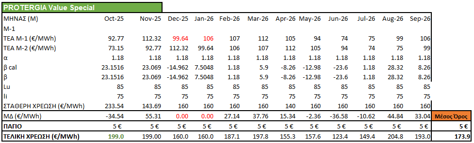 Χρέωση ενέργειας με υπολογισμό τυχόν μηχανισμού διακύμανσης με πρόβλεψη τιμών χονδρικής για τους επόμενους 12 μήνες.