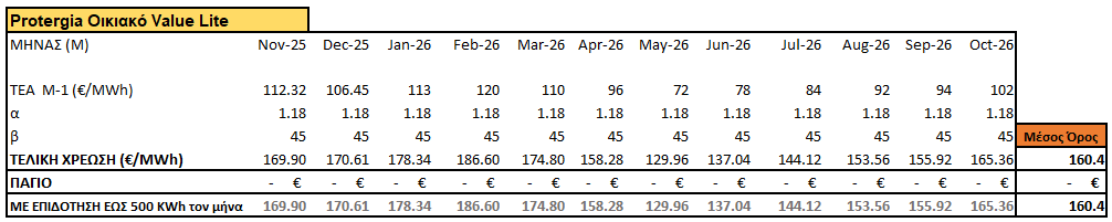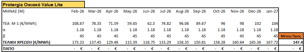 Χρέωση ενέργειας με υπολογισμό τυχόν μηχανισμού διακύμανσης με πρόβλεψη τιμών χονδρικής για τους επόμενους 12 μήνες.