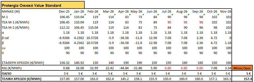 Χρέωση ενέργειας με υπολογισμό τυχόν μηχανισμού διακύμανσης με πρόβλεψη τιμών χονδρικής για τους επόμενους 12 μήνες. Η χρέωση νύχτας προϋποθέτει νυχτερινό μετρητή.
