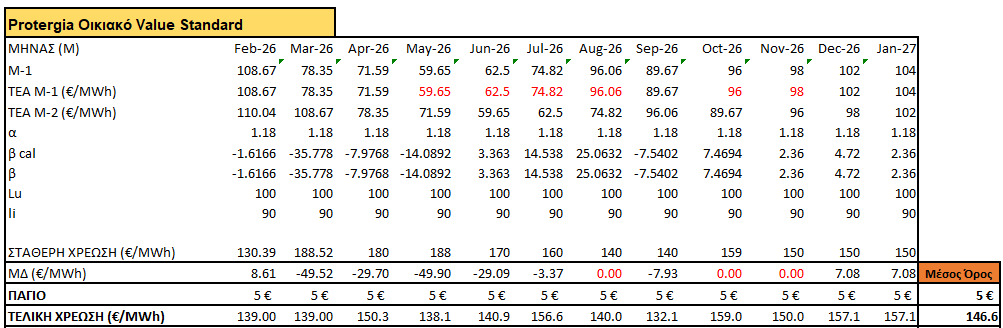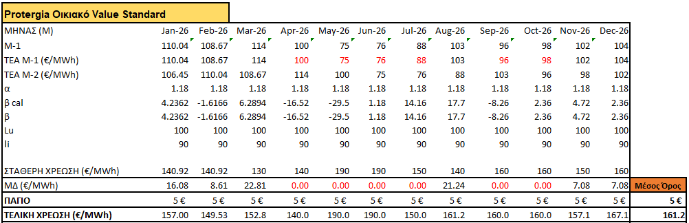 Χρέωση ενέργειας με υπολογισμό τυχόν μηχανισμού διακύμανσης με πρόβλεψη τιμών χονδρικής για τους επόμενους 12 μήνες.