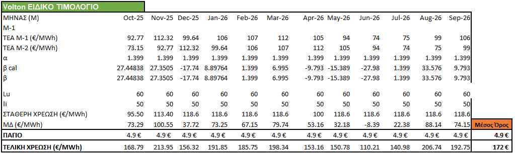 Χρέωση ενέργειας με υπολογισμό τυχόν μηχανισμού διακύμανσης με πρόβλεψη τιμών χονδρικής για τους επόμενους 12 μήνες.