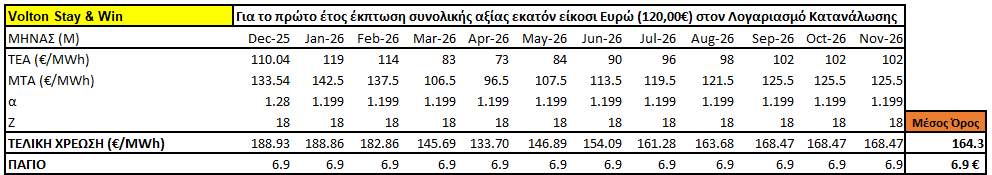 Χρέωση ενέργειας με υπολογισμό τυχόν μηχανισμού διακύμανσης με πρόβλεψη τιμών χονδρικής για τους επόμενους 12 μήνες. Η χρέωση νύχτας προϋποθέτει νυχτερινό μετρητή.