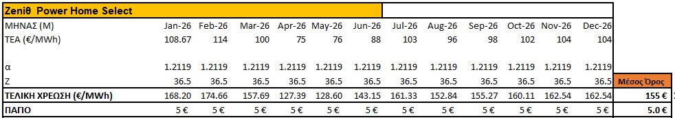 Χρέωση ενέργειας με υπολογισμό τυχόν μηχανισμού διακύμανσης με πρόβλεψη τιμών χονδρικής για τους επόμενους 12 μήνες. Η χρέωση νύχτας προϋποθέτει νυχτερινό μετρητή.