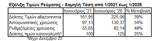 Εμείς όμως στο allazorevma.gr έχουμε την συνήθεια, εδώ και χρόνια να κρατάμε κατάστιχα. Ρίχνοντας μια ματιά στα ιστορικά στοιχεία του Δείκτη Τιμών του allazorevma.gr λοιπόν (βλέπε Πίνακα παρακάτω) συνειδητοποιήσαμε κάτι που ακόμα και για μας ήταν έκπληξη. Από το 2021 μέχρι σήμερα, οι αυξήσεις στα ρυθμιζόμενα (που είναι όλες αυξήσεις στις χρεώσεις δικτύων) είναι σωρευτικά πολύ μεγαλύτερες (+48%) από τις ανταγωνιστικές χρεώσεις (+38%) – και βέβαια πολύ υψηλότερες από τον πληθωρισμό (Δείκτη Τιμών Καταναλωτή)*.